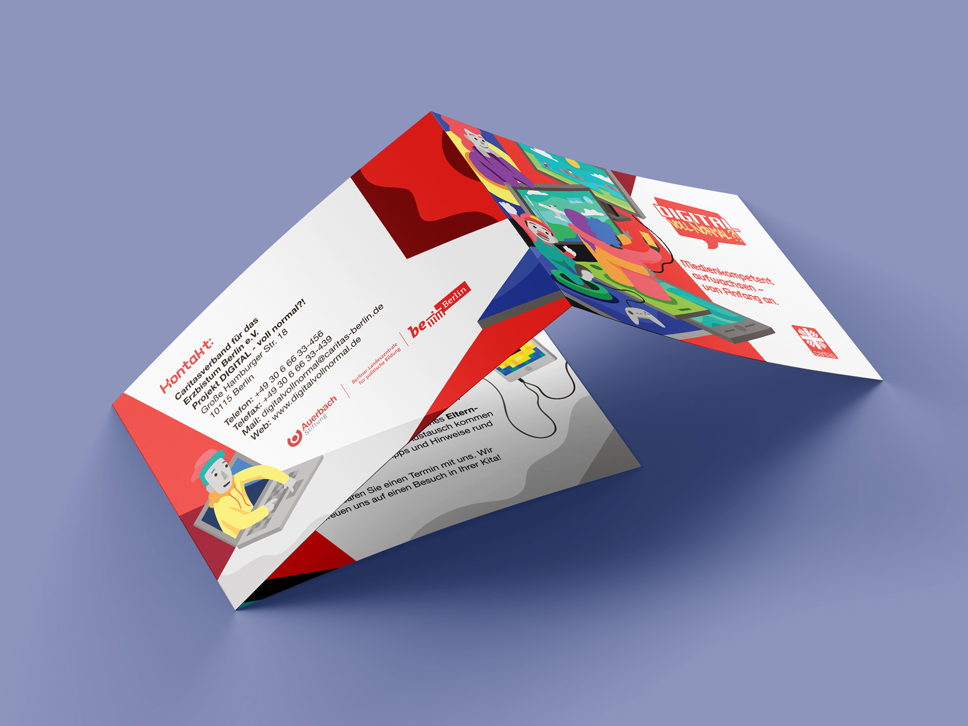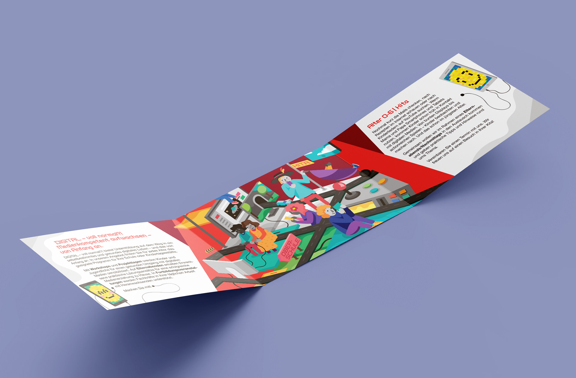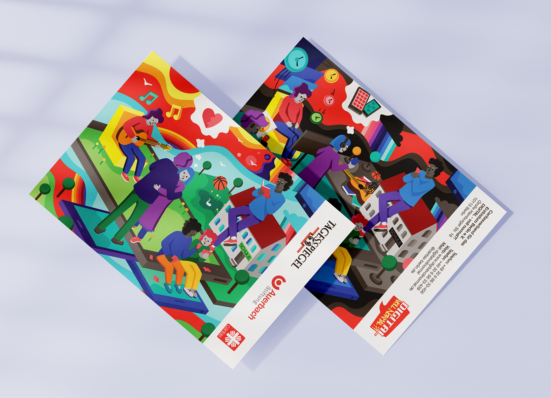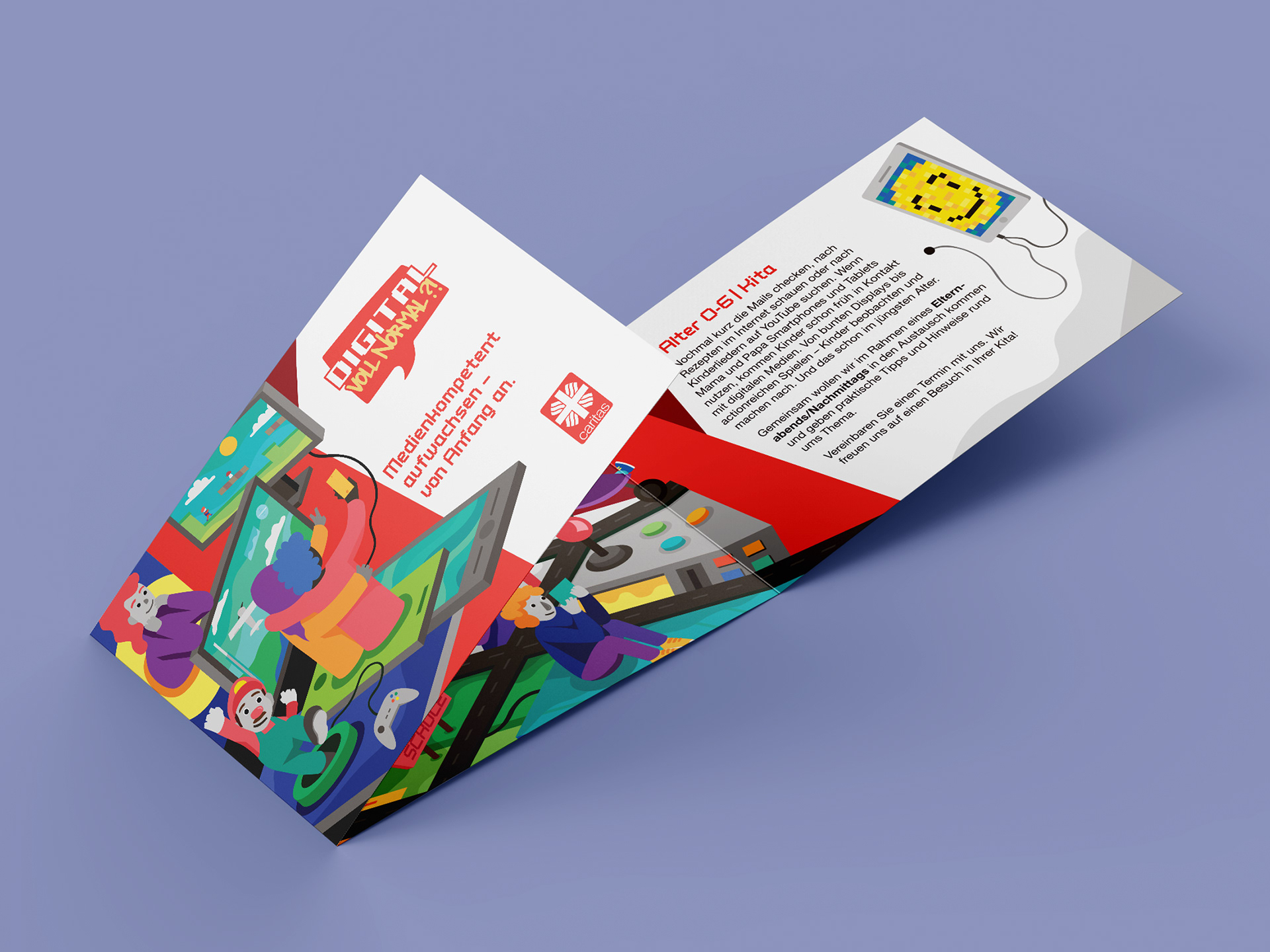 For the prevention project Digital – voll normal?!, I developed a cohesive visual design and a range of communication materials. These included a flyer, postcard, web banners, and a series of illustrations addressing digital media use and prevention in an accessible, engaging way. The design combines a modern, friendly visual style with clear information structure, effectively reaching children, young people, and educators alike.