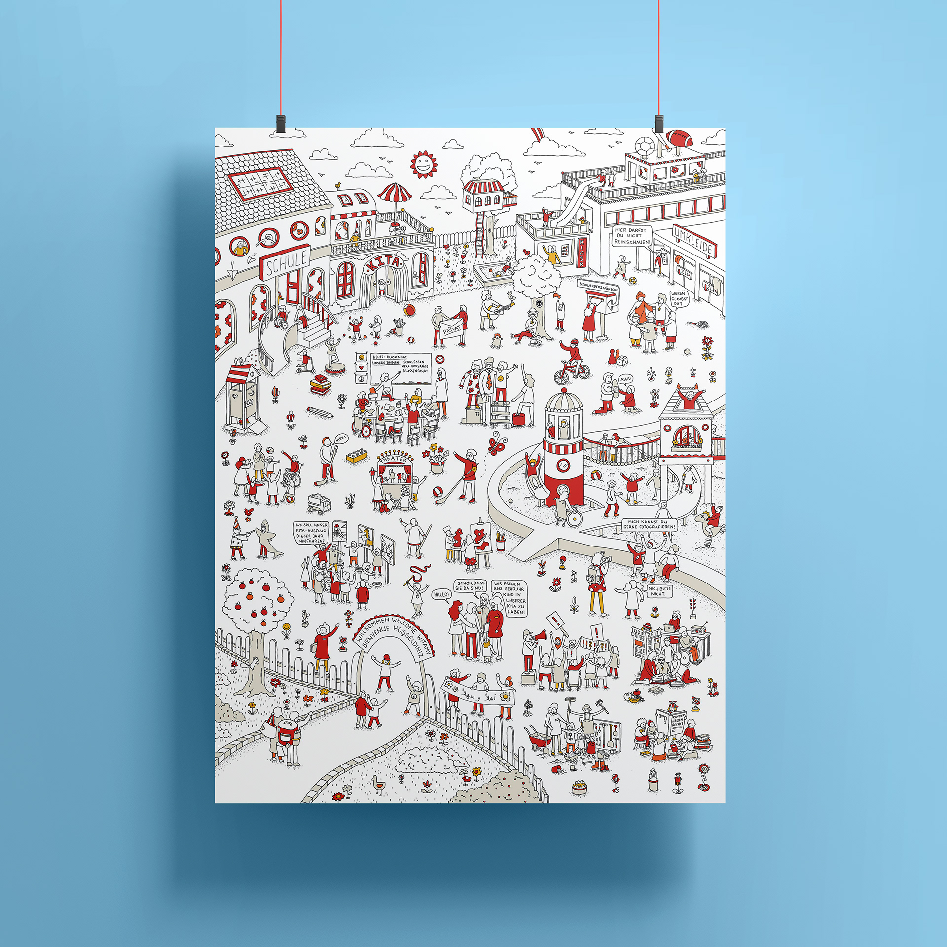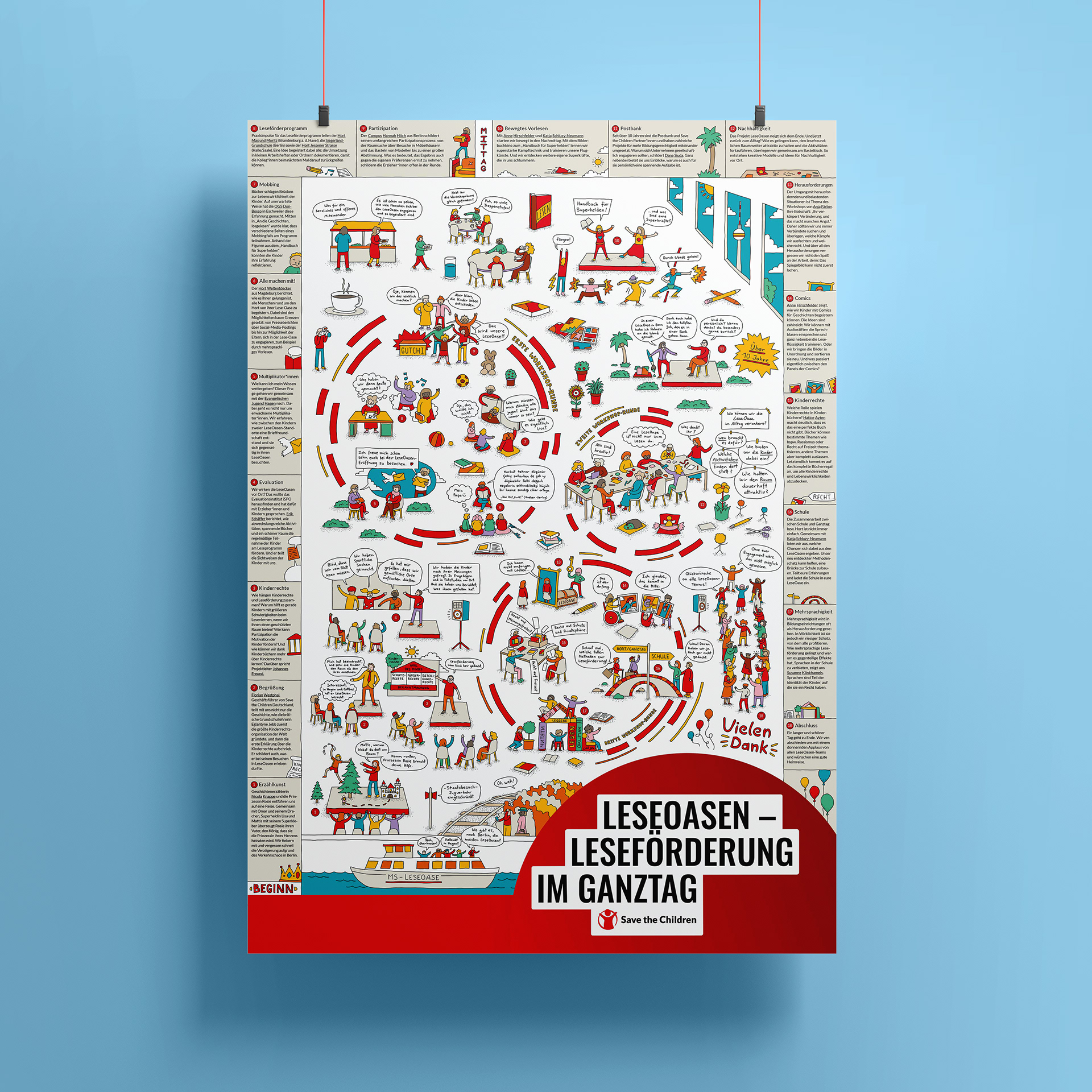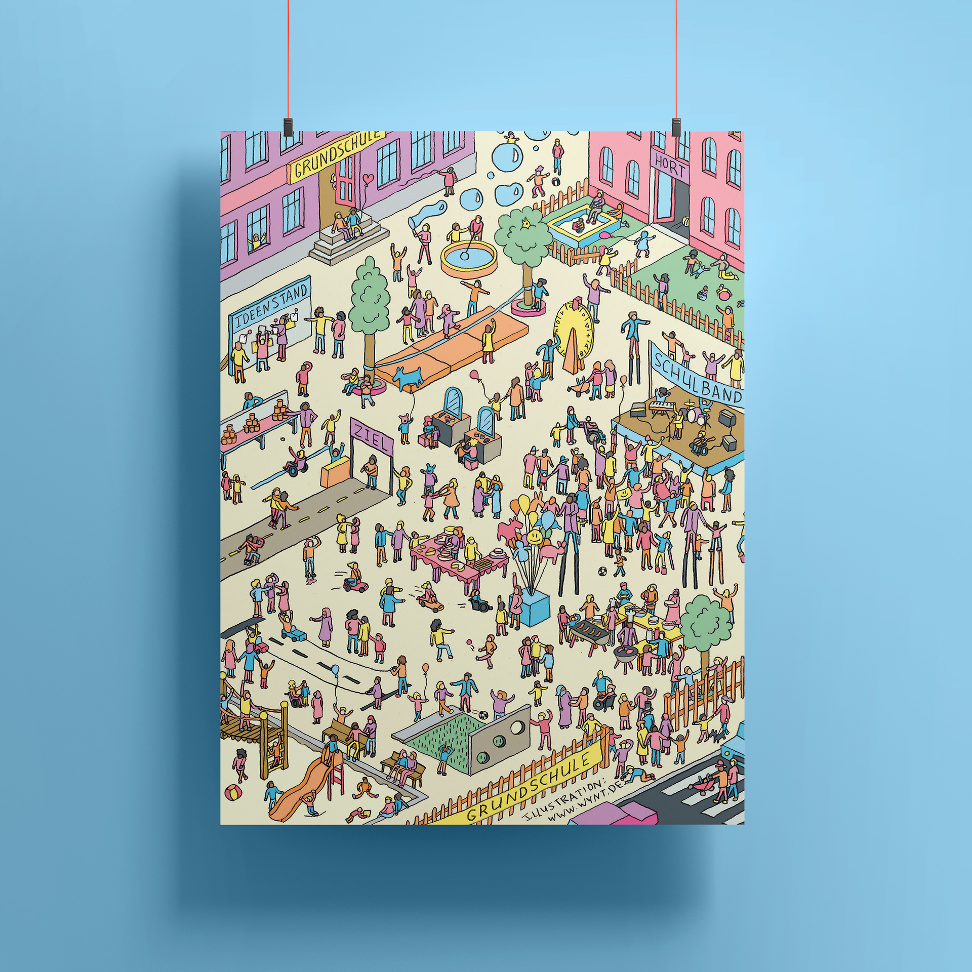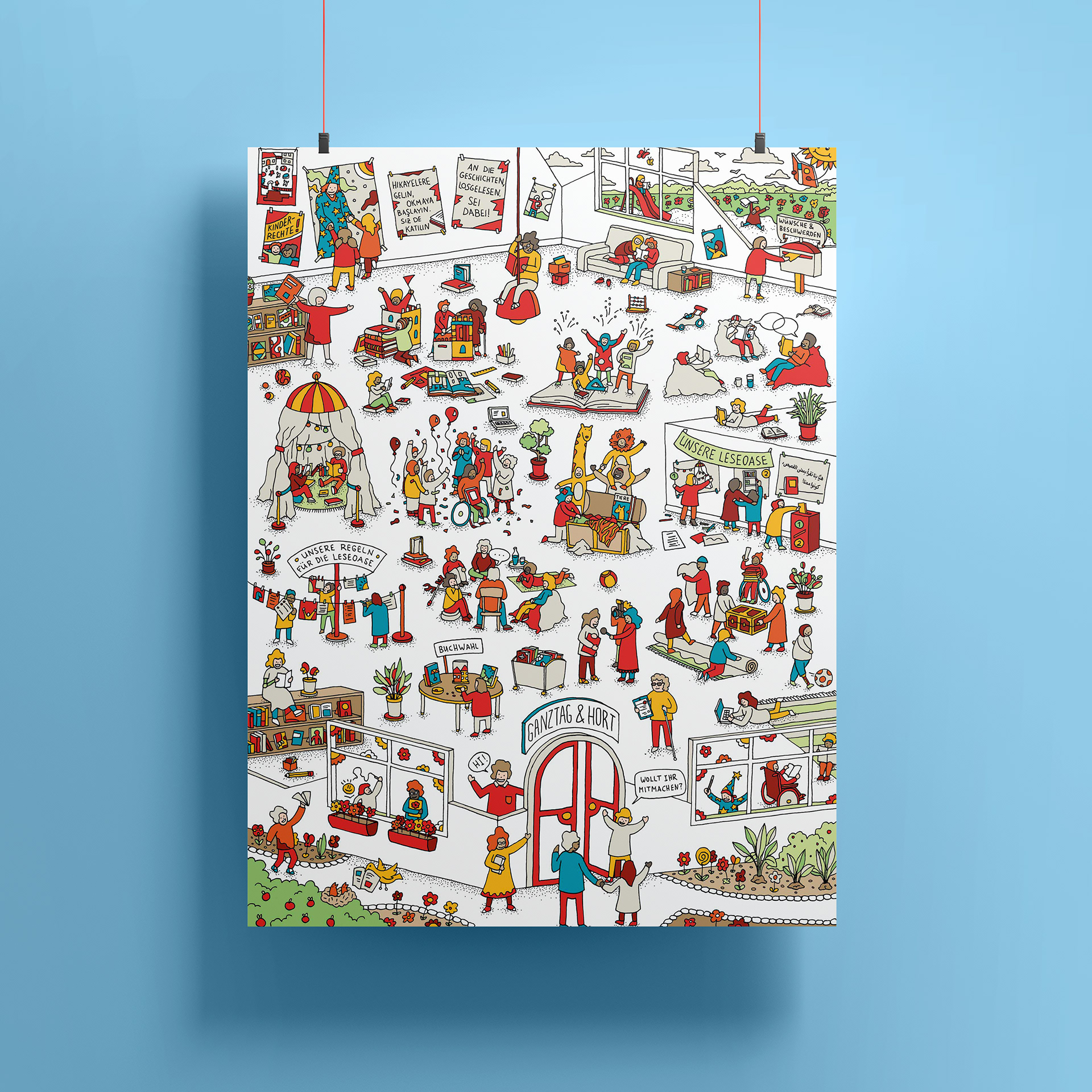 Since 2017, I have been collaborating with the “Leseoasen” (Reading Oases) project by Save the Children e.V. In this context, numerous busy scene illustrations have been created, which are used as posters. Individual motifs have also been published in various publications and educational materials. In addition, I designed the character of a little gnome, who has been part of the project since the end of 2025.